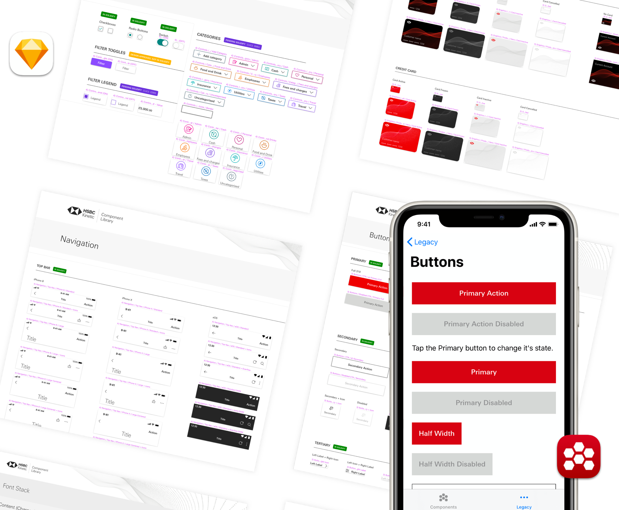 Consistent use of the HSBC Brand colours connects all the customers’ digital experiences together. The angularity of The Hexagon, the most recognisable asset of HSBC, determines the types of shapes that are selected to add meaning and emphasis to the UI.